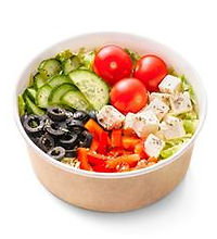 Кубики брынзы, маслины, салатный лист, помидоры, болгарский перец и заправка
